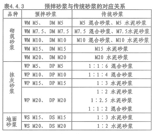 4.4.3 预拌砂浆与传统砂浆的对应关系参见表4.4.3,供选择使用预拌砂浆时参考。